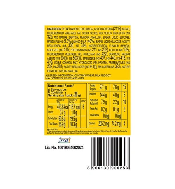 Indulge your taste buds with the delightful combination of soft, fluffy cake, luscious mango-flavored filling, and a rich chocolate coating. The Choco Pie Real Mango is the perfect snack to satisfy your cravings, whether you're at home, work, or on the go. Priced at just ₹10 per piece and available in a convenient Pack of 18, it’s a treat the whole family can enjoy!