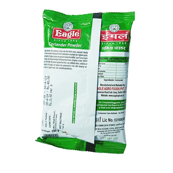 Elevate your culinary creations with the aromatic and flavorful Coriander Powder - 100g from the trusted brand Eagle. This finely milled spice is a pantry essential for every home chef, adding a burst of freshness and earthy warmth to your favorite recipes. Sourced and prepared with care, it ensures unmatched quality and taste in every pinch.